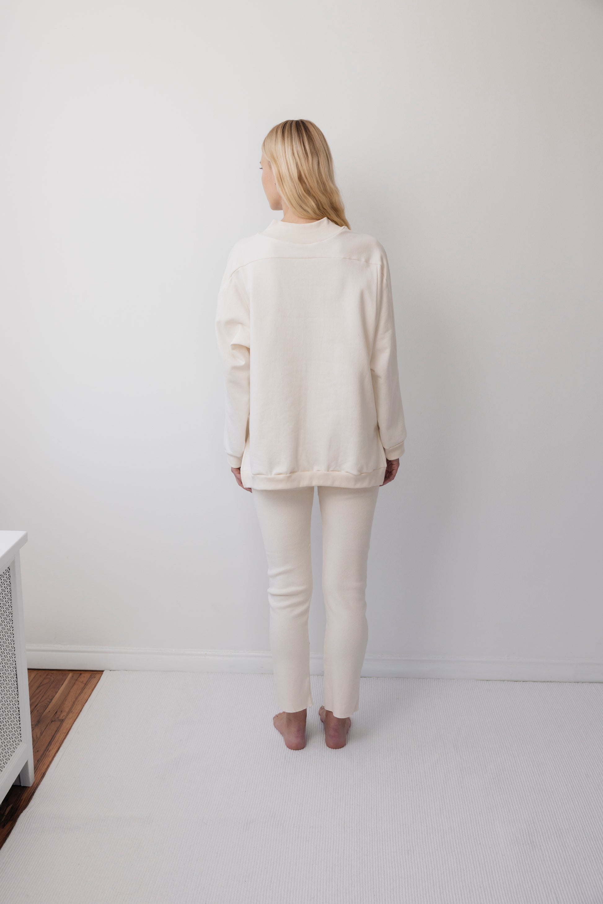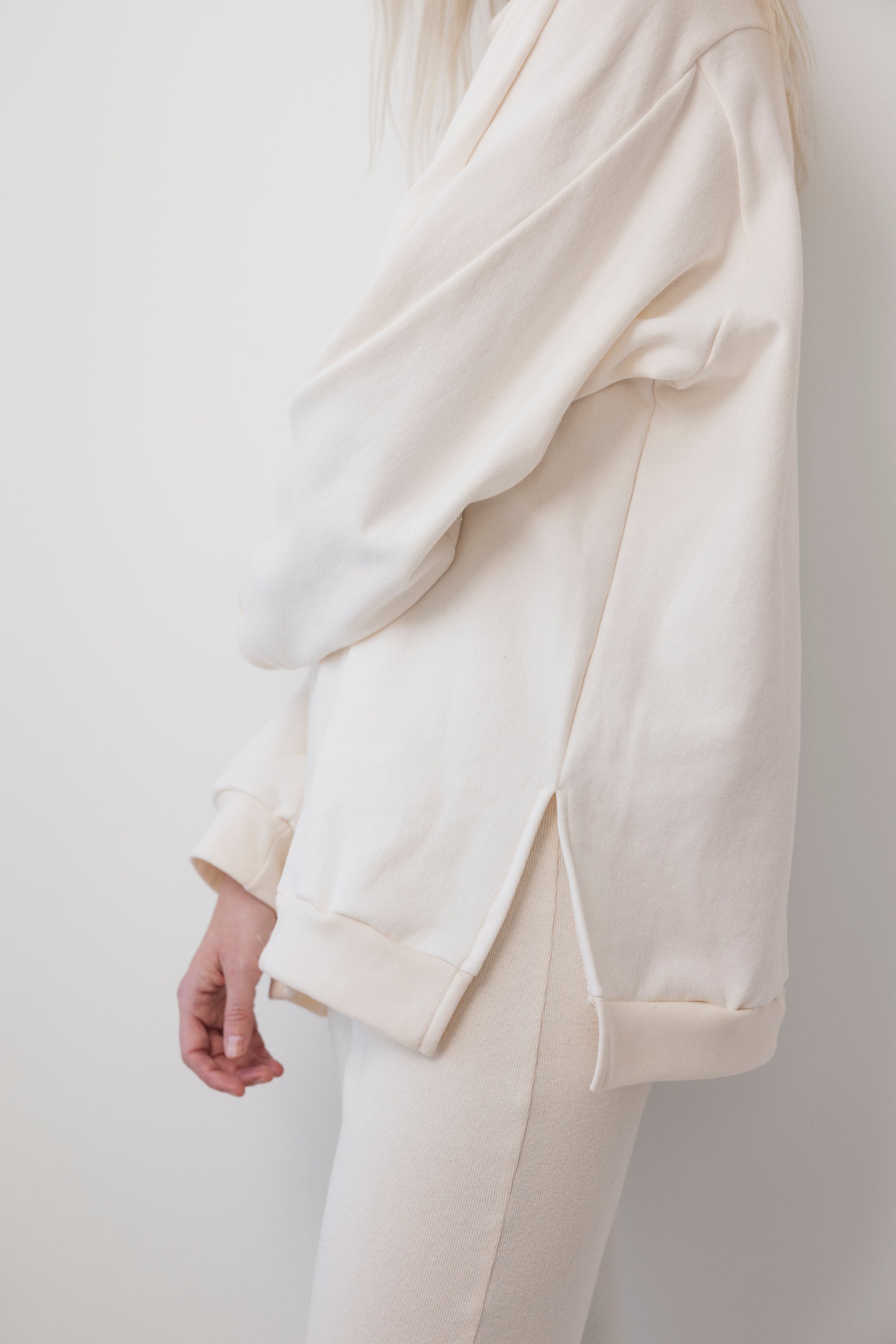 Oversized mock neck sweatshirt with our signature shoulder gusset seam detail in a longer length than our Easy Sweatshirt. Wide rib hem at bottom with side seam vents. A wide rib mock neck and rib cuff at sleeve.