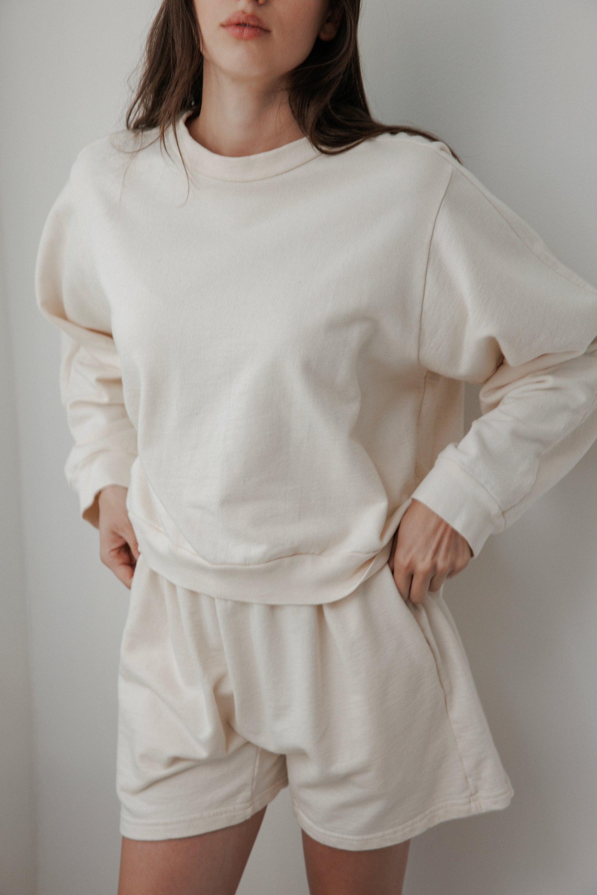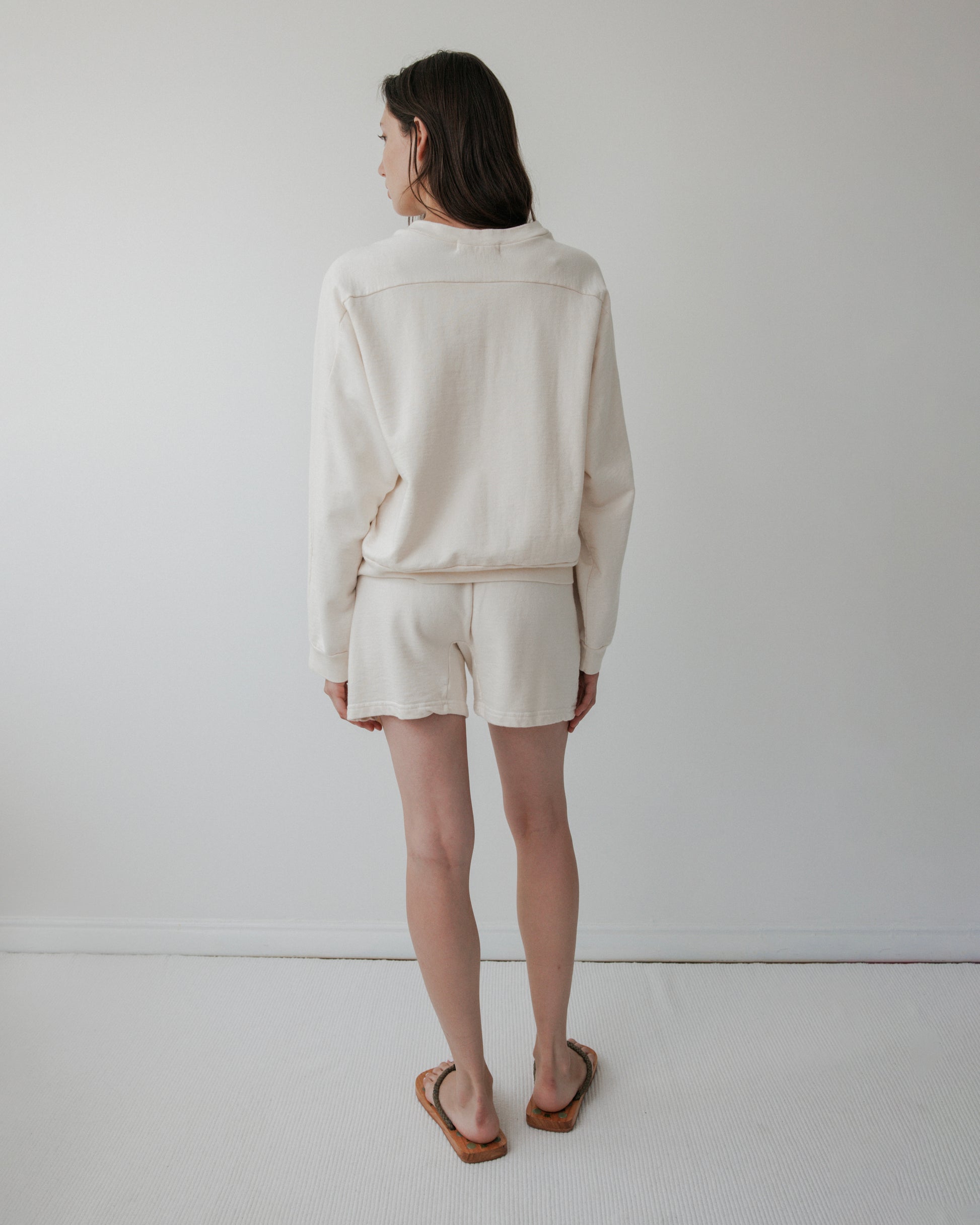 Our classic summer short with a high rise and elastic waist. Signature inseam and outseam gusset detail at leg with side seam pockets. Done in our organic cotton french terry (loopy and soft interior). This style is entirely made in America - from fiber to finish.