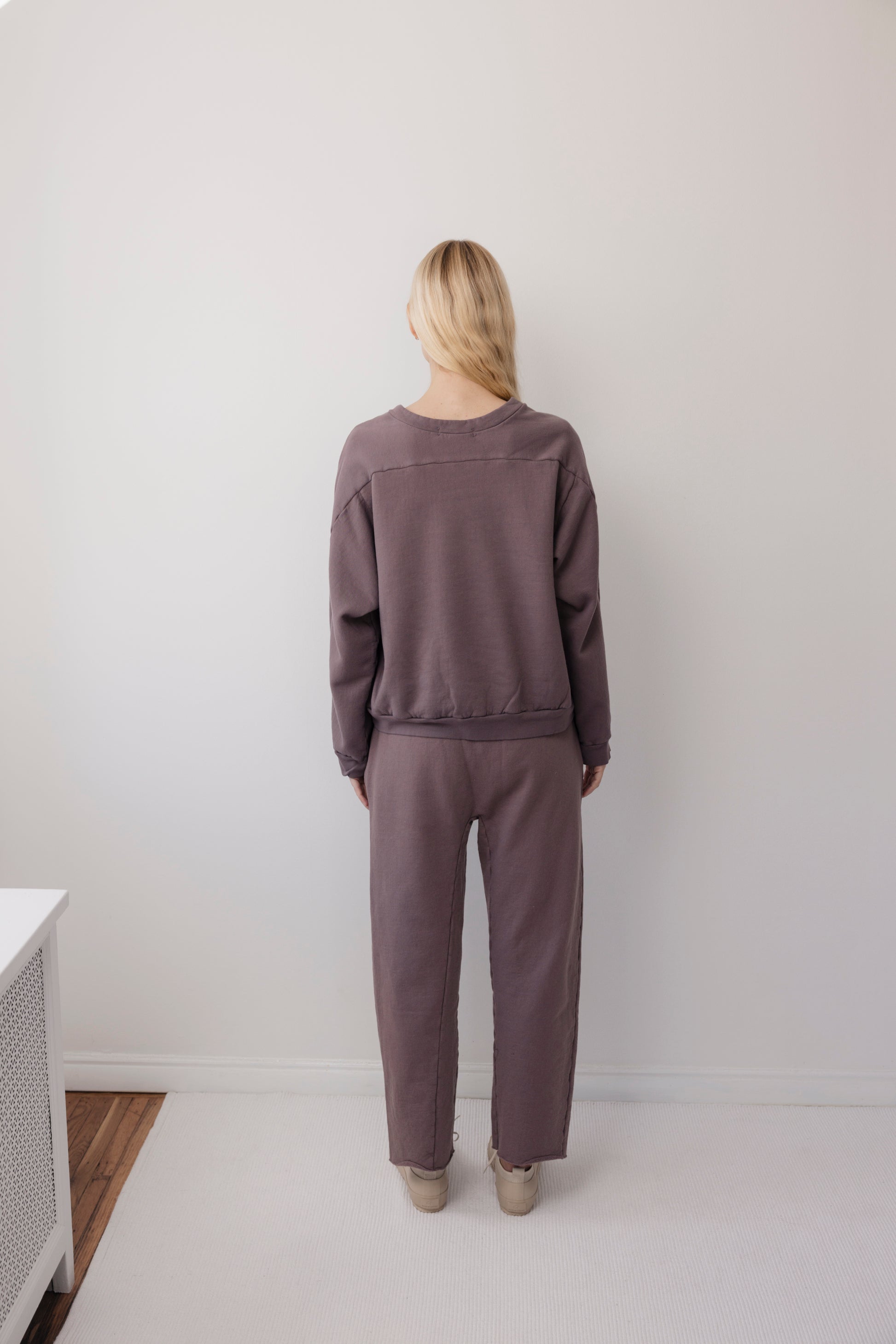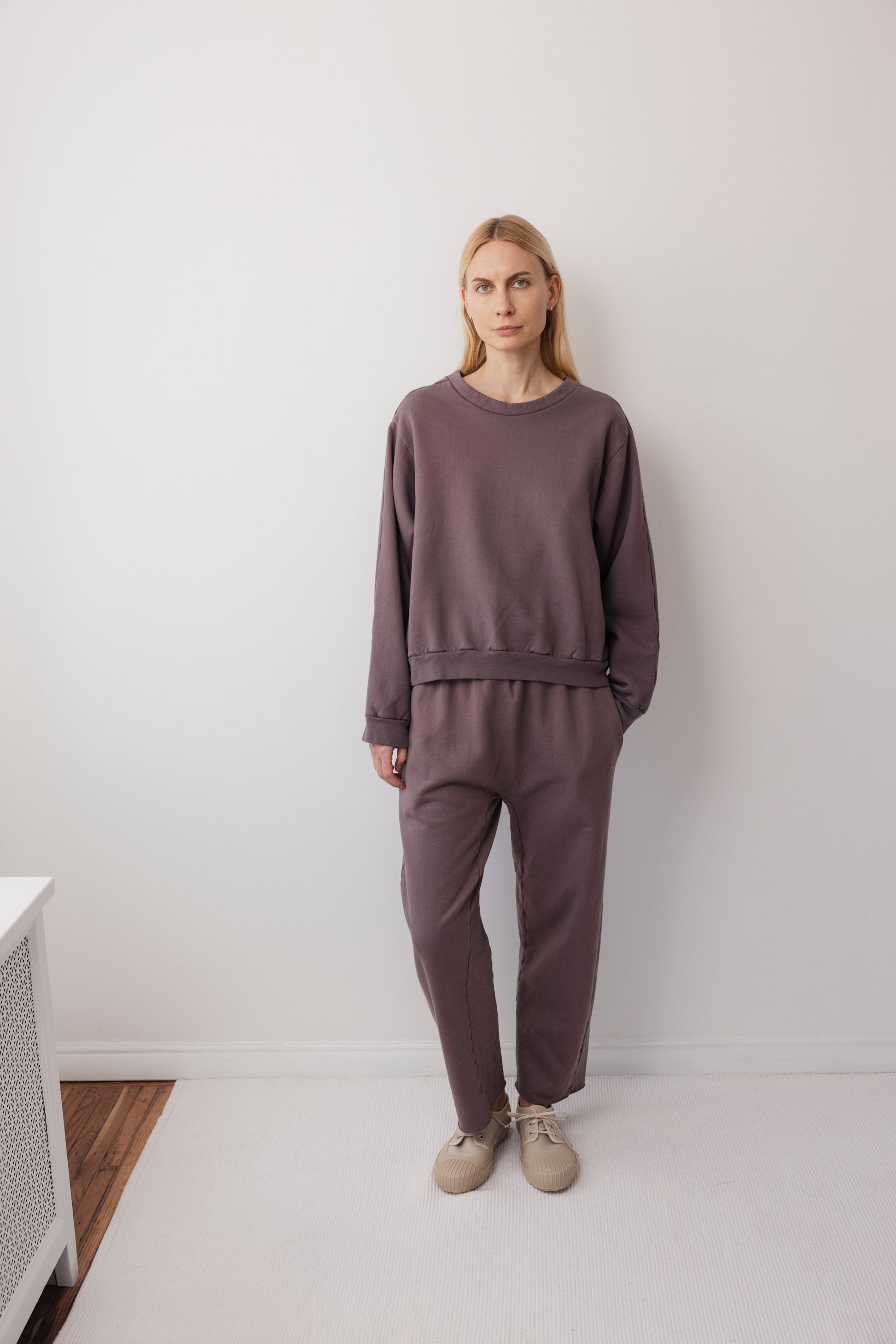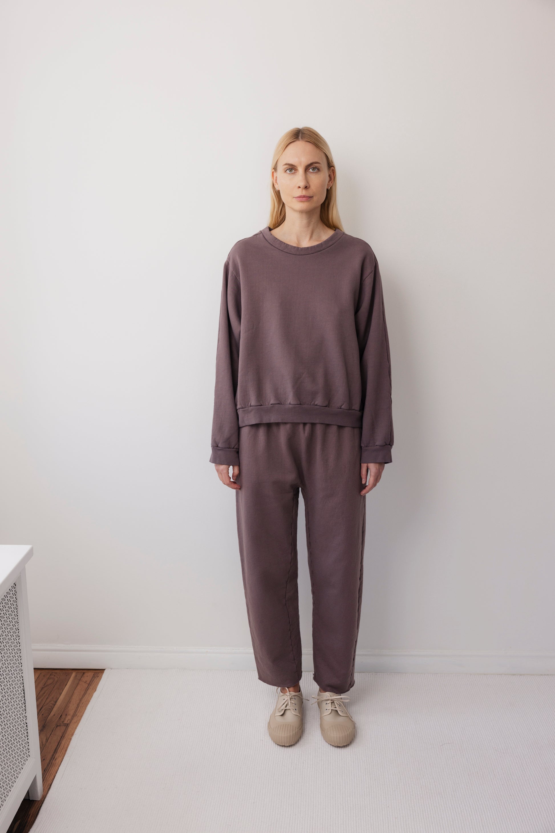 Boxy crew neck sweatshirt with our signature shoulder gusset seam detail in a slightly cropped length. Wide rib hem at bottom and rib cuff at sleeve.