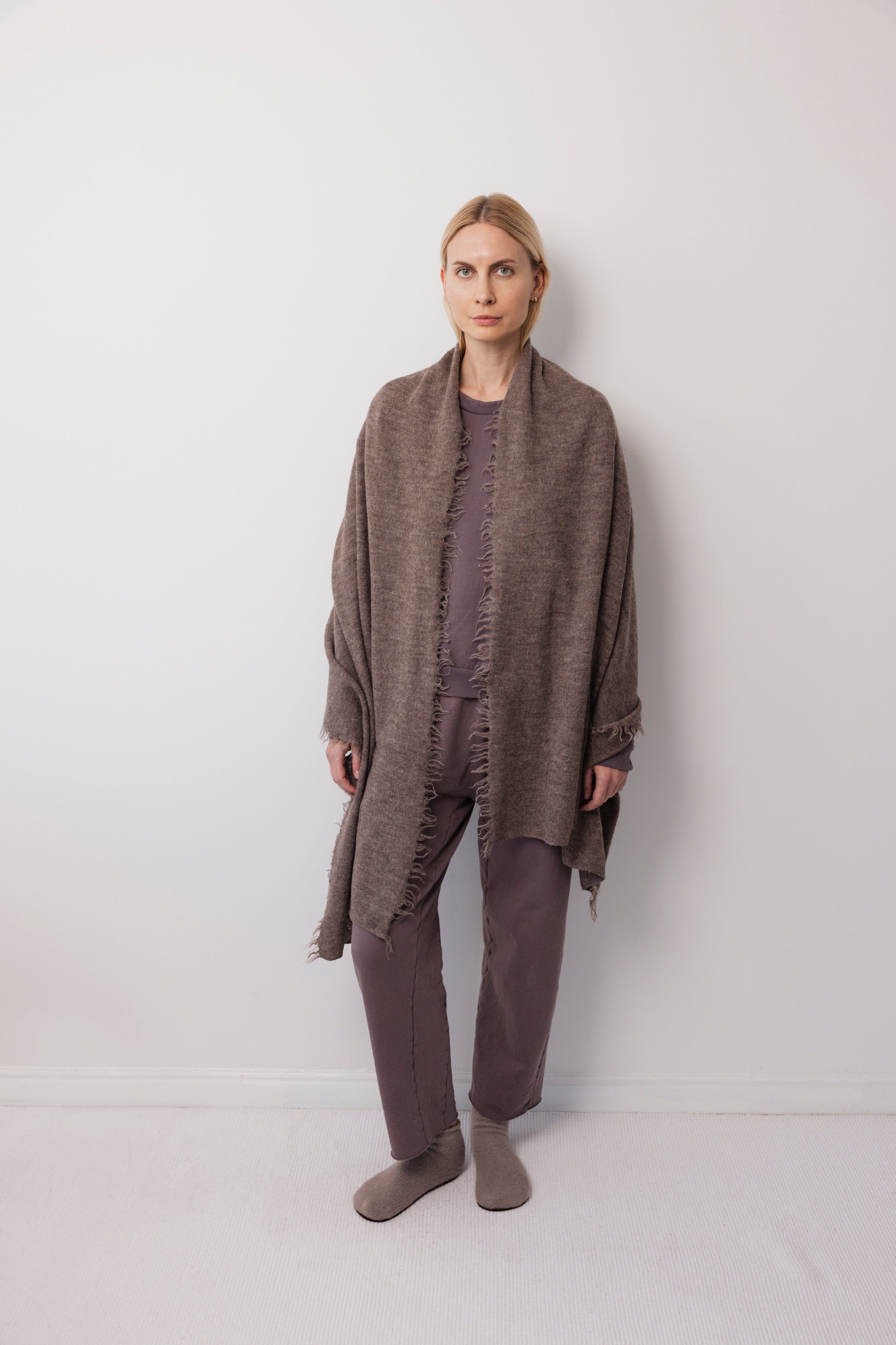 A fine gauge oversized knit scarf that's been lightly felted. Fringe details at the edges. This is soft and airy with a fuzzy texture.