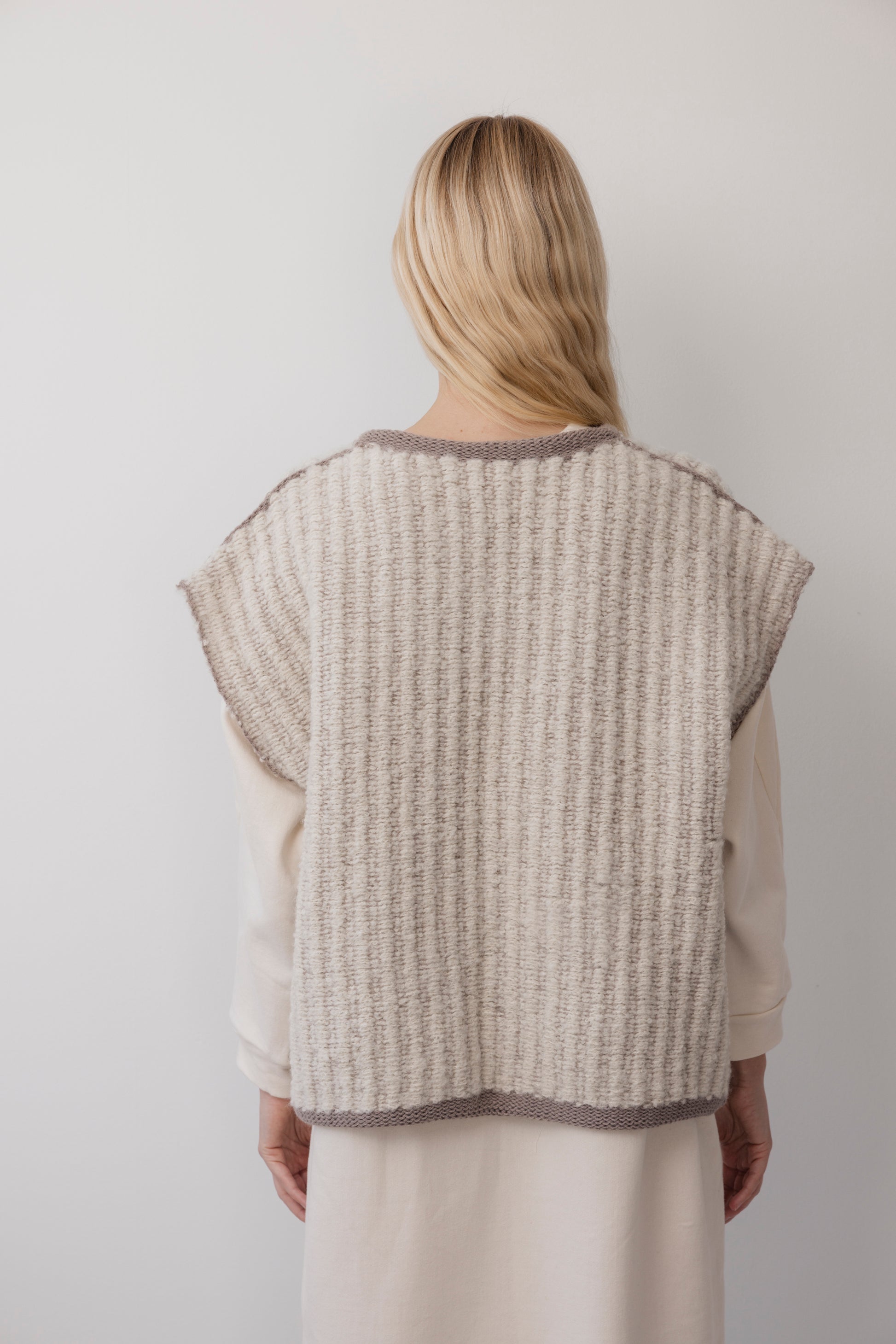 Hand-loomed wide open vest with a curved front. This intricate knit / weave technique has a base yarn with a super bulky, lofty yarn "woven" in to the knit stitches. This is dense and warm while staying lofty and soft with the boucle yarn. *note that in production, the front has a more gently sloped curve than in the photos*