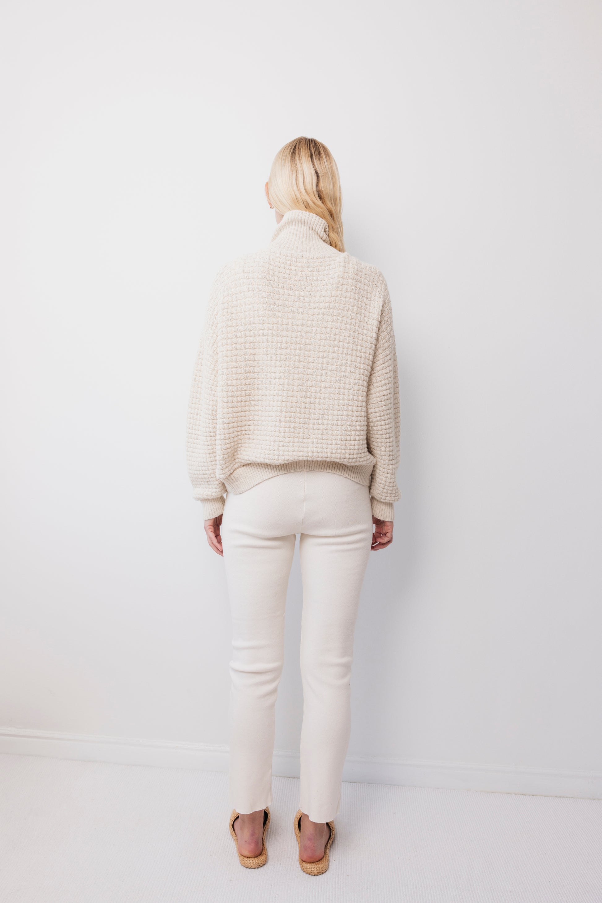 A slightly cropped, lighter weight cardigan with an all over textural lattice stitch. High rib collar, rib cuffs and hem with unvarnished wood buttons. This finer gauge yarn is soft and spongey with a silky hand feel. The yarn supports regenerative land management. The organization we partner with is dedicated to transparency and fair pay to the farmers.