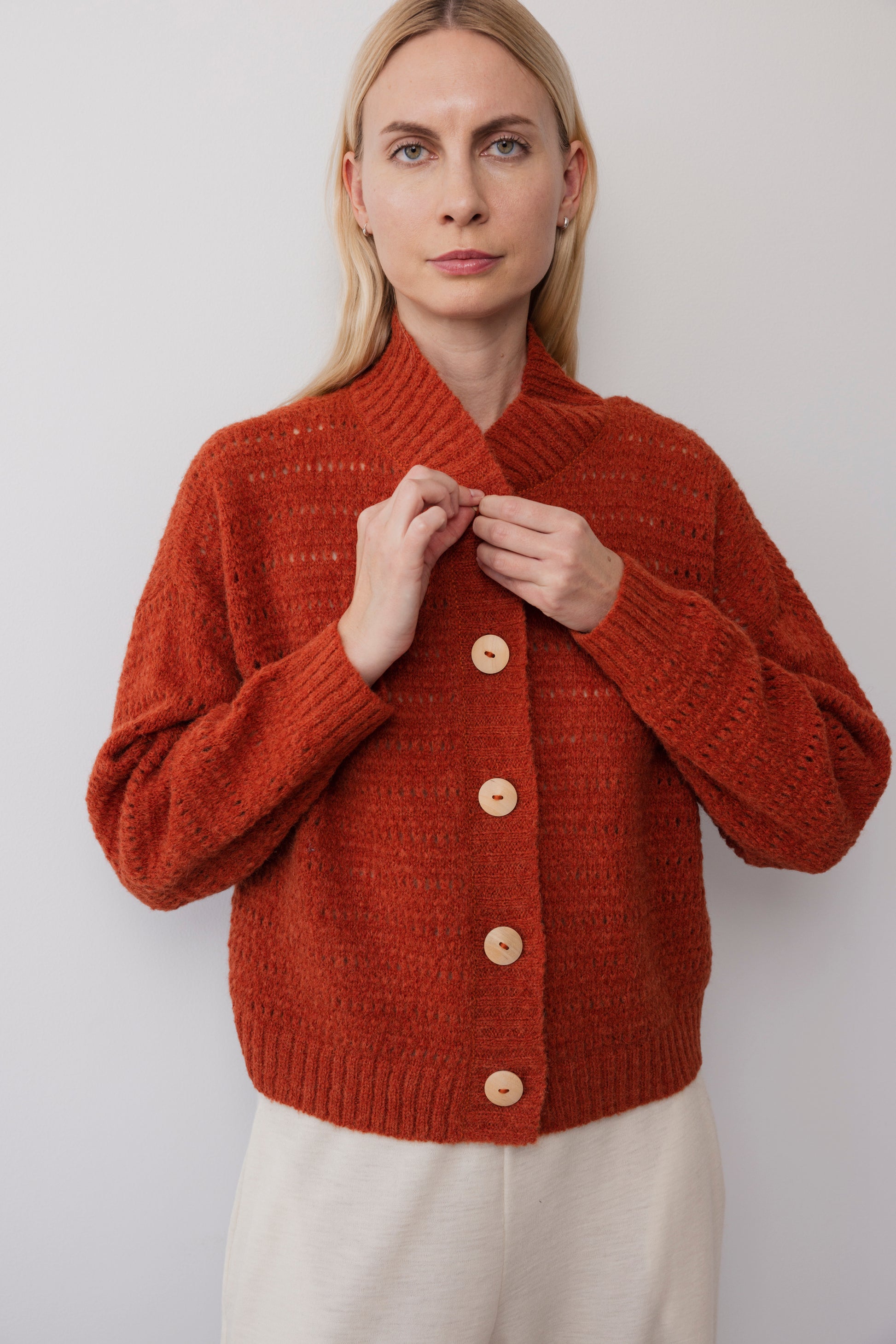 Our classic bomber reimagined in a lighter weight fuzzy yarn and an open work stitch. This has the same cropped, boxy shape and rounded collar as always but a lighter and softer feel. Unvarnished wood buttons.