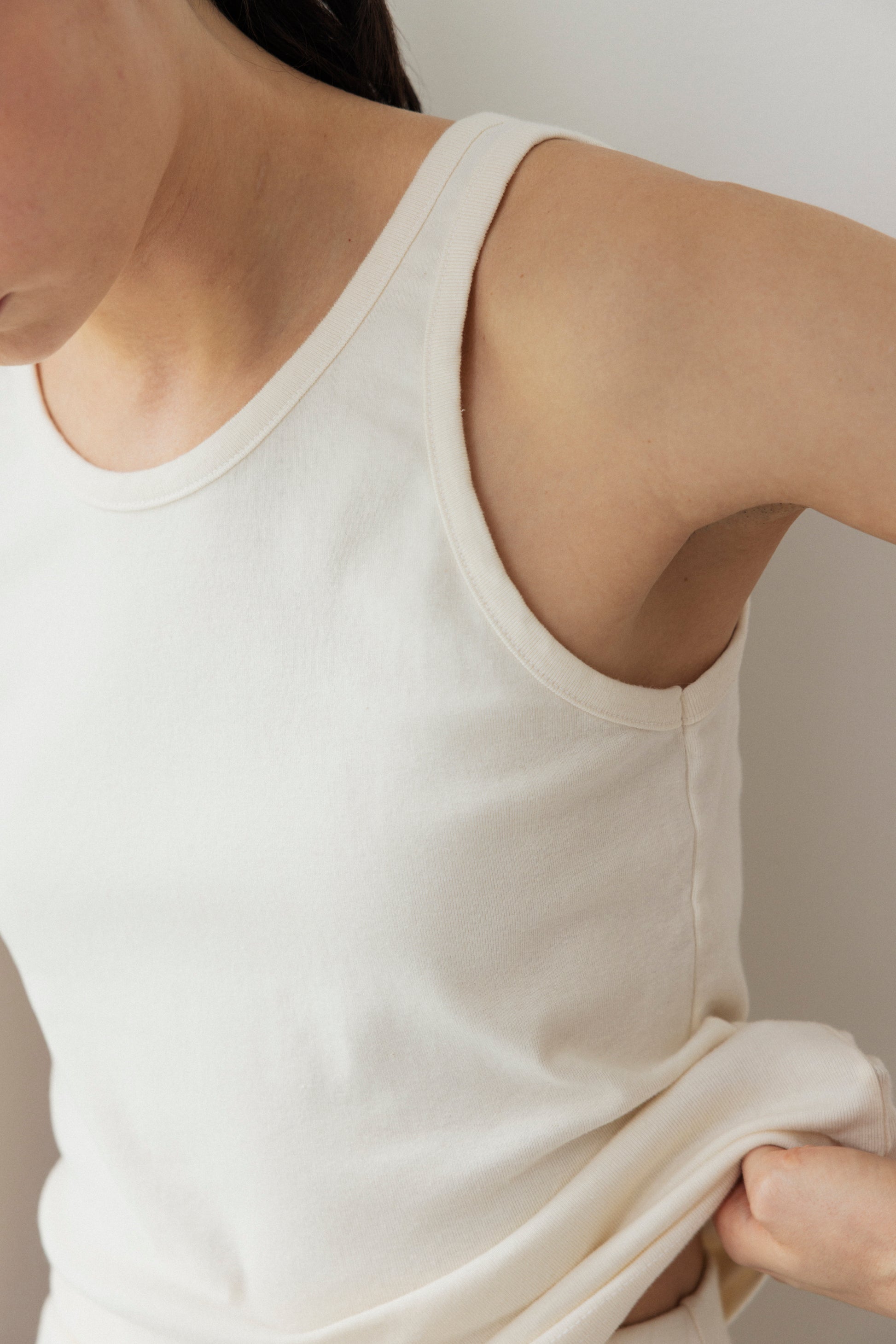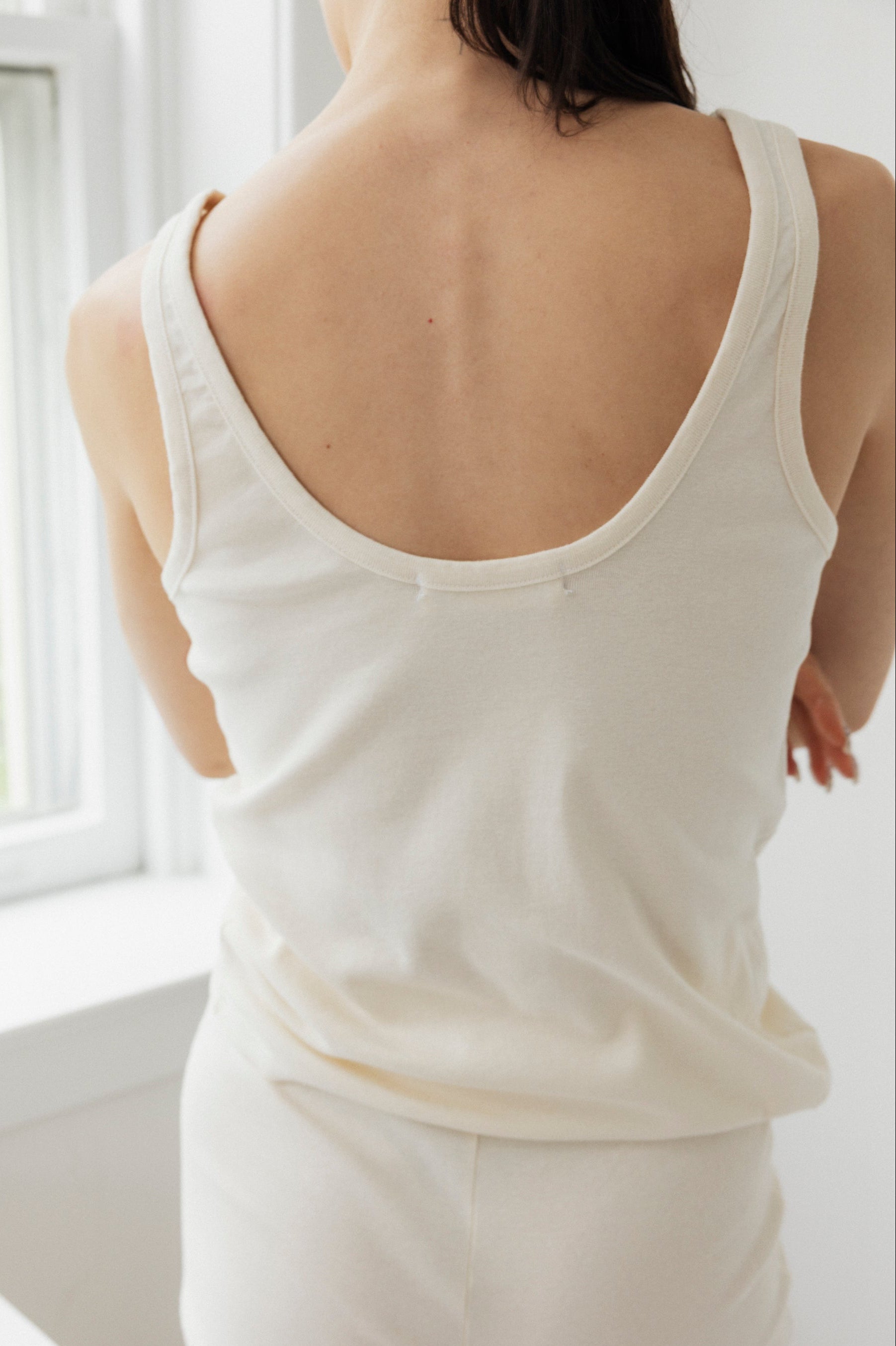 Fitted tank perfect for layering. Finished with banded edges and a low scoop back. Done in our lightweight organic cotton baby rib. This style is entirely made in America - from fiber to finish.