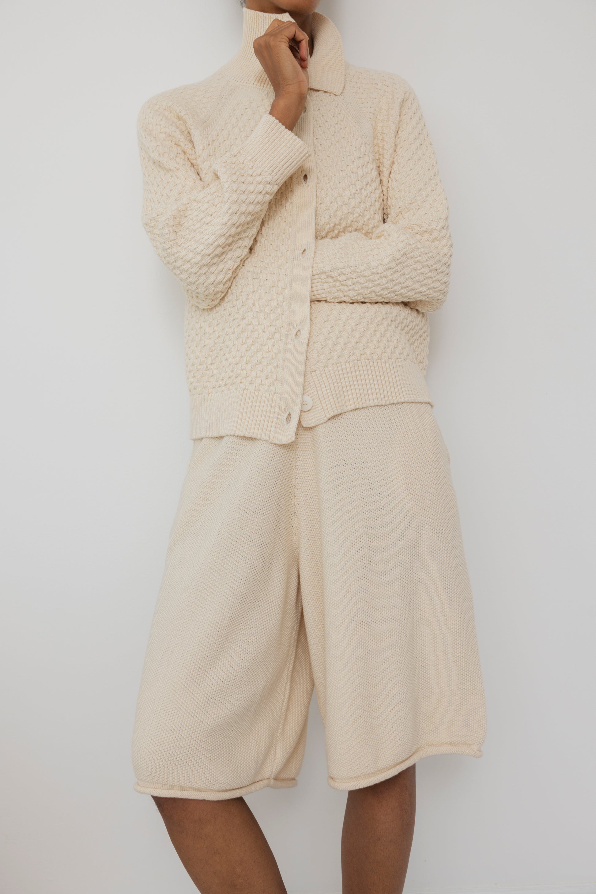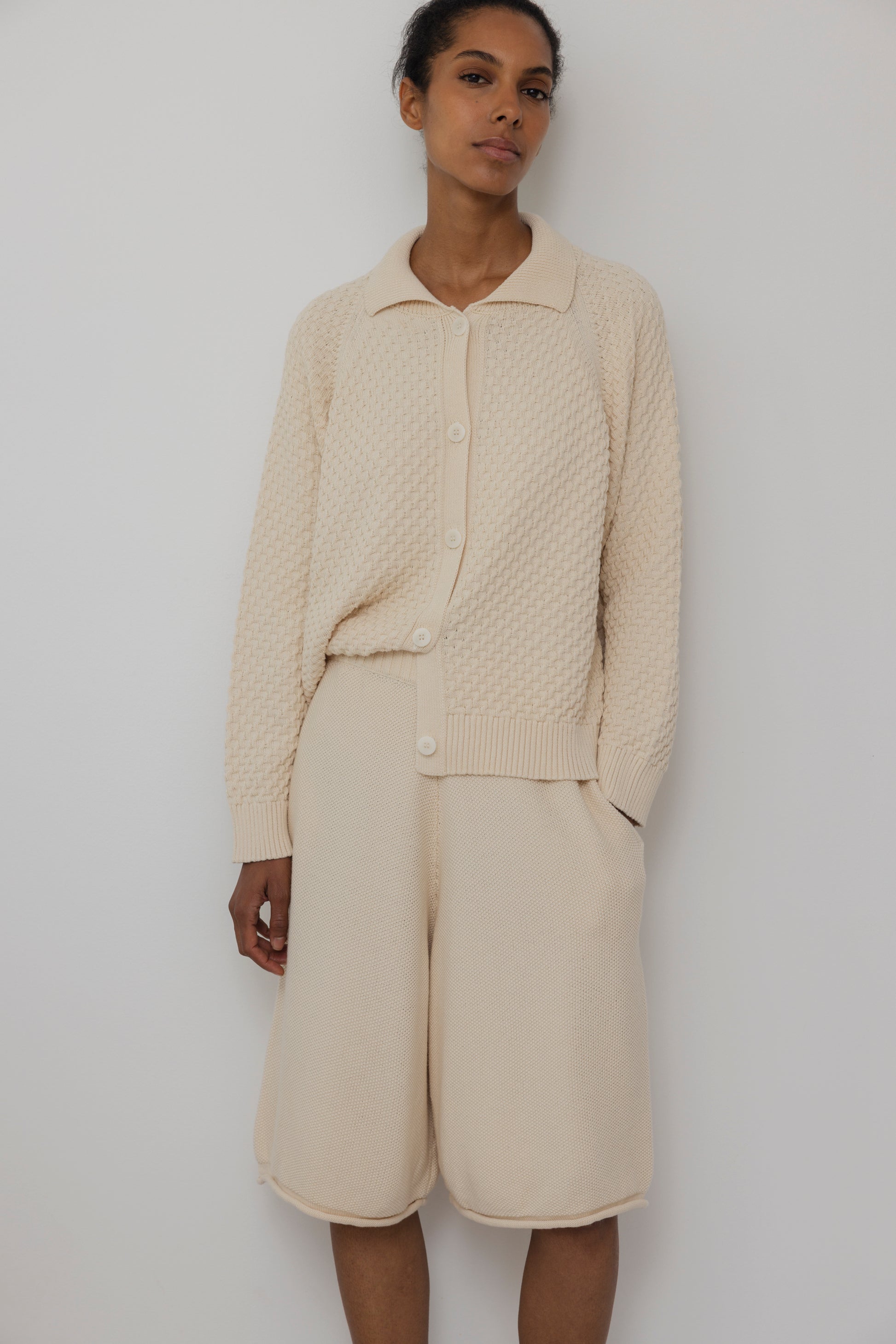 Loose, long shorts in an all over textured seed stitch. Rolled edge hem, elastic waist and side seam pockets. This is made with 100% Organic, domestic cotton and then knit in NYC. The cotton is lightweight and has a soft yet slightly crisp hand feel. Natural is undyed.
