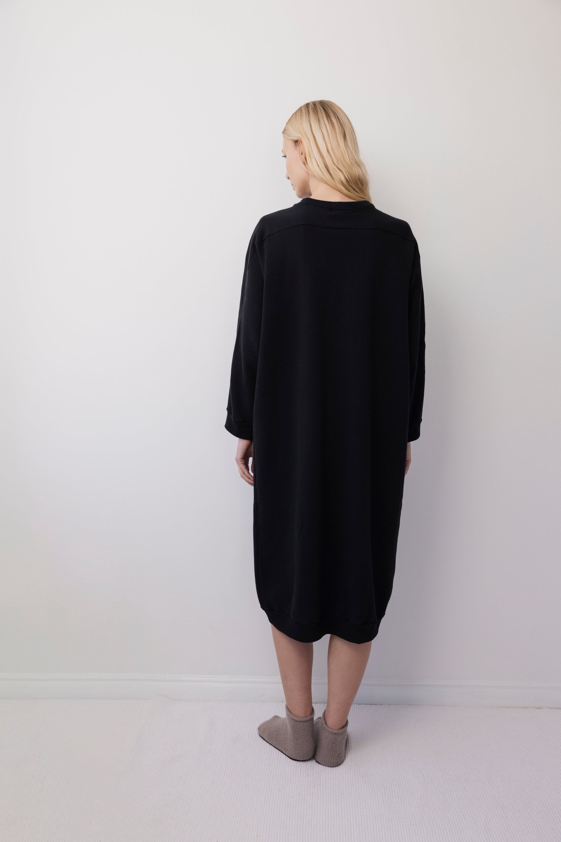 An oversized, dress version of our Easy Sweatshirt. Mid length with our signature shoulder gusset and seam detail and side seam pockets. Wide rib hem at bottom and rib cuff at sleeve. Done in our 100% USA grown and sewn organic cotton fleece fabric, ultra soft and fuzzy-inside.