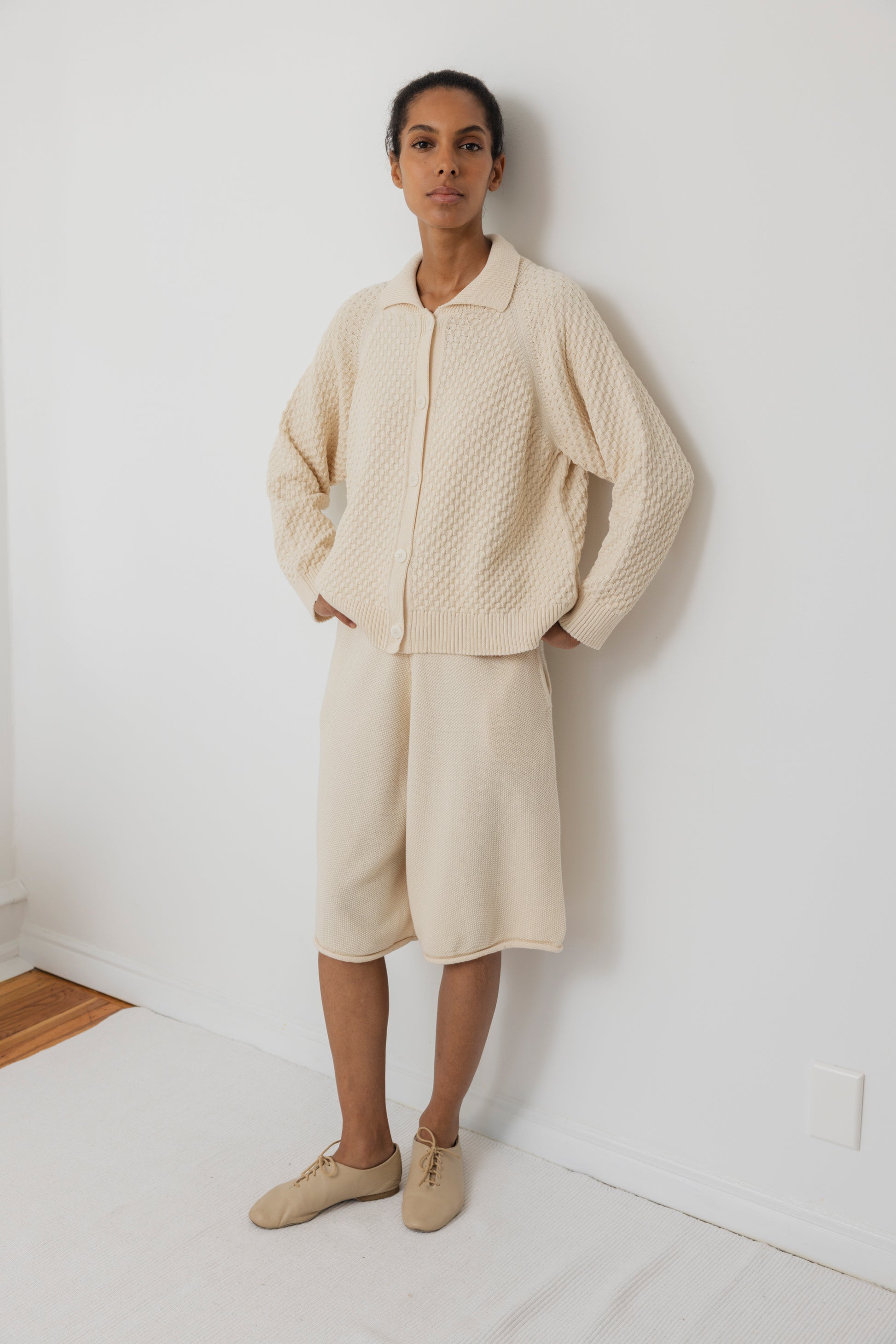 Perfect fit cardigan with an all over highly textured stitch, rib edges and a long rib collar. Perfect to layer year round. This is made with 100% Organic, domestic cotton and then knit in NYC. Corozo buttons. The cotton is lightweight with the stitch adding some bulkiness to the style, it has a soft yet slightly crisp hand feel. Natural is undyed.