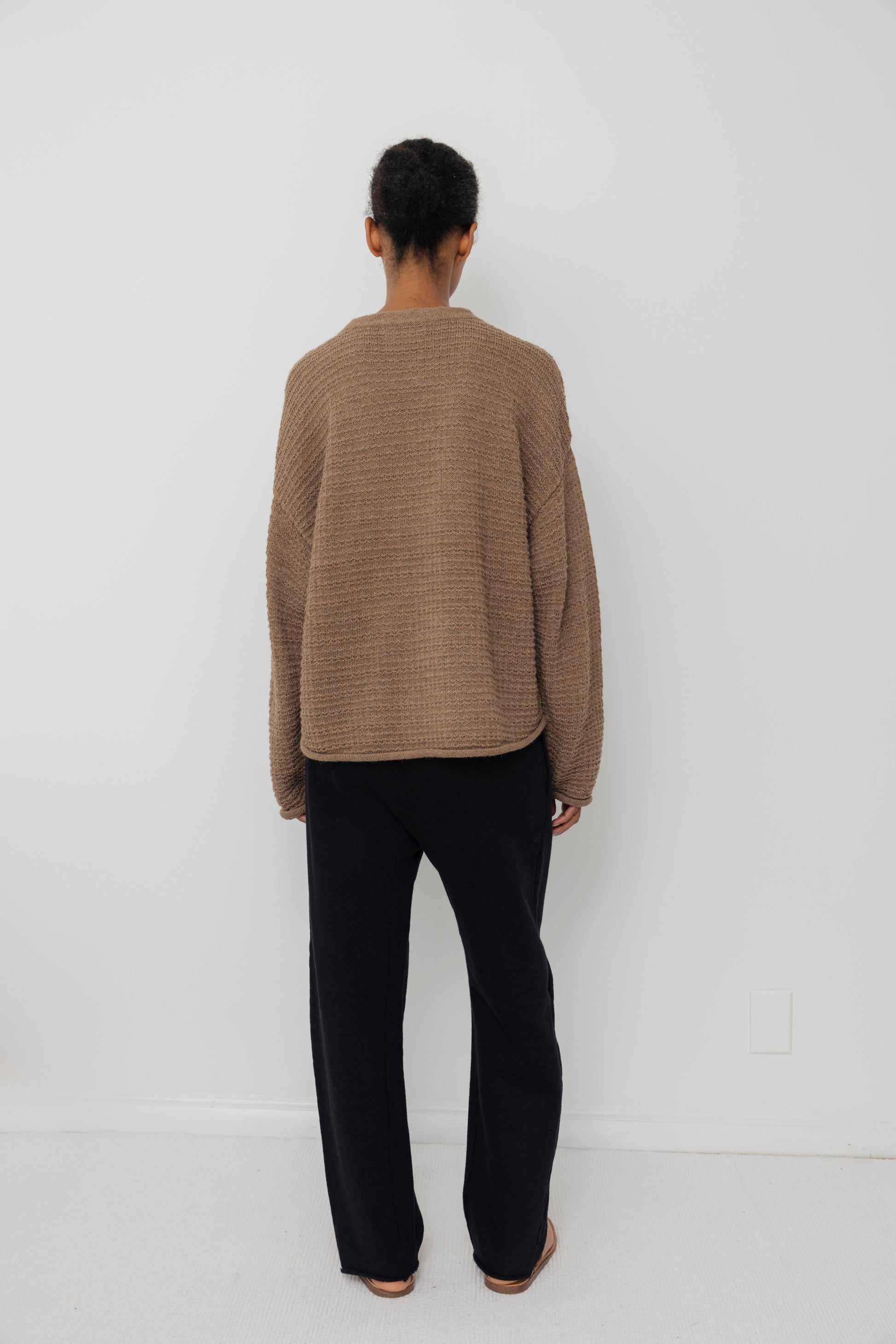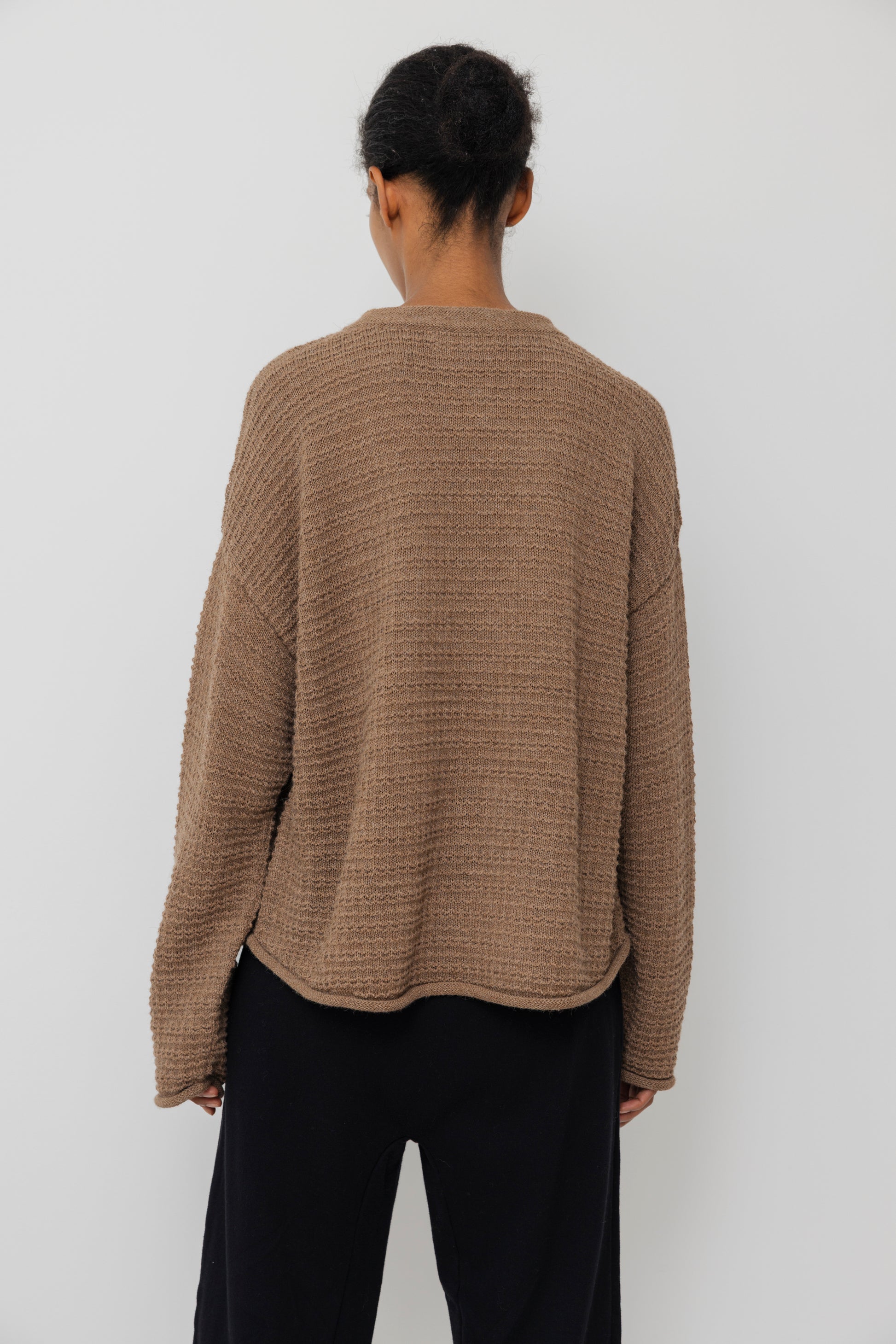 Loose fitting, light weight pullover sweater with curved hem, curled cuffs and a gentle U neck. This finer gauge yarn is soft and spongey with a silky hand feel. The yarn supports regenerative land management. The organization we partner with is dedicated to transparency and fair pay to the farmers.